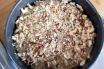 This is a lovely moist apple cake topped with a crunchy pecan crumble. It’s a multi-tasking cake, one to serve up warm for pudding, with custard or ice cream, or as a stolen slice with a cup of tea in the afternoon. I decided to use both cooking apple and eating apples to add some different textures to the cake. So start by peeling and chopping one bramley apple and one eating apple into medium sized chunks. Melt a good knob of butter in a pan and sprinkle in a tablespoon of light brown sugar. Add the apples and cook over a medium heat for a few minutes until they start to soften. Leave to cool whilst you make the cake topping.