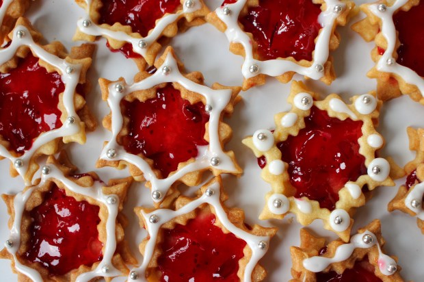 Christmas seems to creep up faster every year – I feel like I’ve barely done any Christmas baking this year and suddenly it’s here! This lack of baking hasn’t exactly translated into a lack of eating though. There is a near constant supply of mince pies in the office, fuelling me through those mid morning and mid afternoon slumps, which meant that when a baking opportunity finally arose I was actually feeling a bit mince pied out. So I made these little jam sandwich biscuits instead, an easy little mince pie alternative. They’re that perfect combination of light and fruity, yet satisfyingly buttery and crisp, with the added bonus of looking like little Christmas jewels.